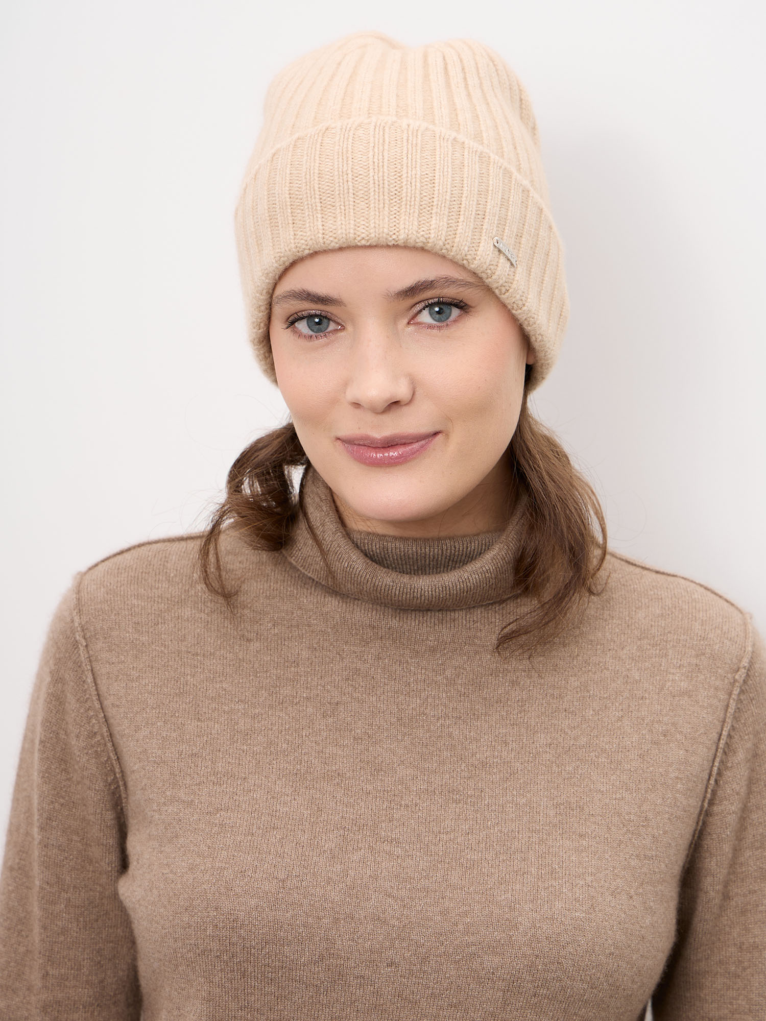 Лаконичная женская шапка из натурального кашемира — идеальный выбор для холодного сезона. Модель выполнена в универсальном бежевом оттенке, который легко сочетается с базовым и классическим гардеробом. Мягкая фактура и аккуратная форма обеспечивают комфортную посадку и элегантный внешний вид.