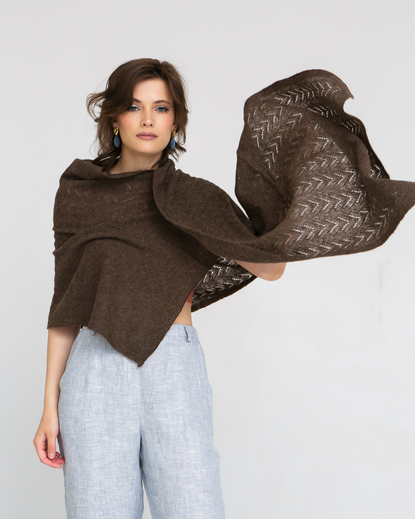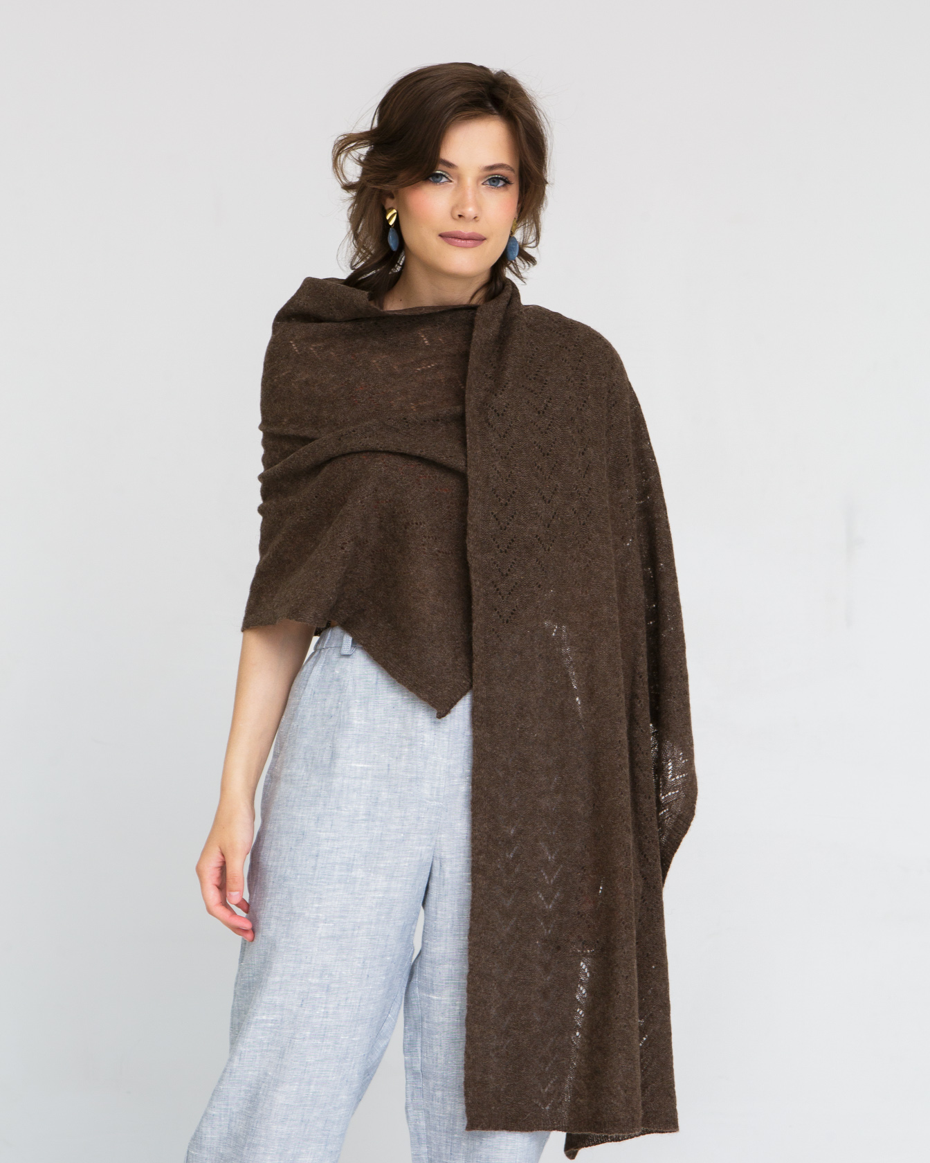 Палантин выполнен в классической прямоугольной форме с изящной ажурной вязкой. Рельефный узор придаёт изделию выразительную текстуру и визуальную лёгкость. Полотно мягко струится и красиво ложится на плечи, создавая элегантный силуэт.