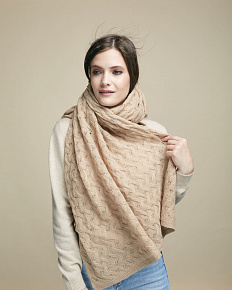 Палантин выполнен в классической прямоугольной форме с изящной ажурной вязкой. Фактурный узор придаёт изделию выразительность и визуальную лёгкость. Полотно мягко струится и образует аккуратные складки, создавая элегантную драпировку.