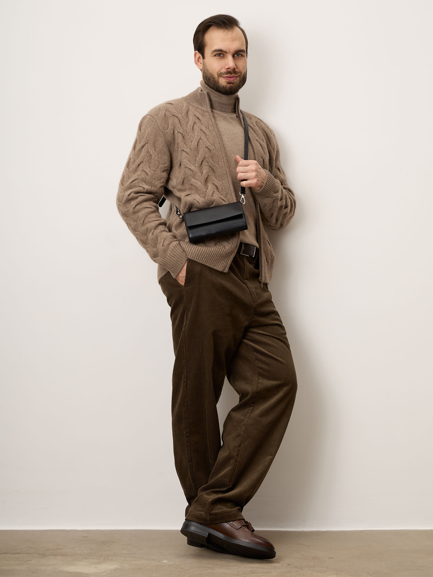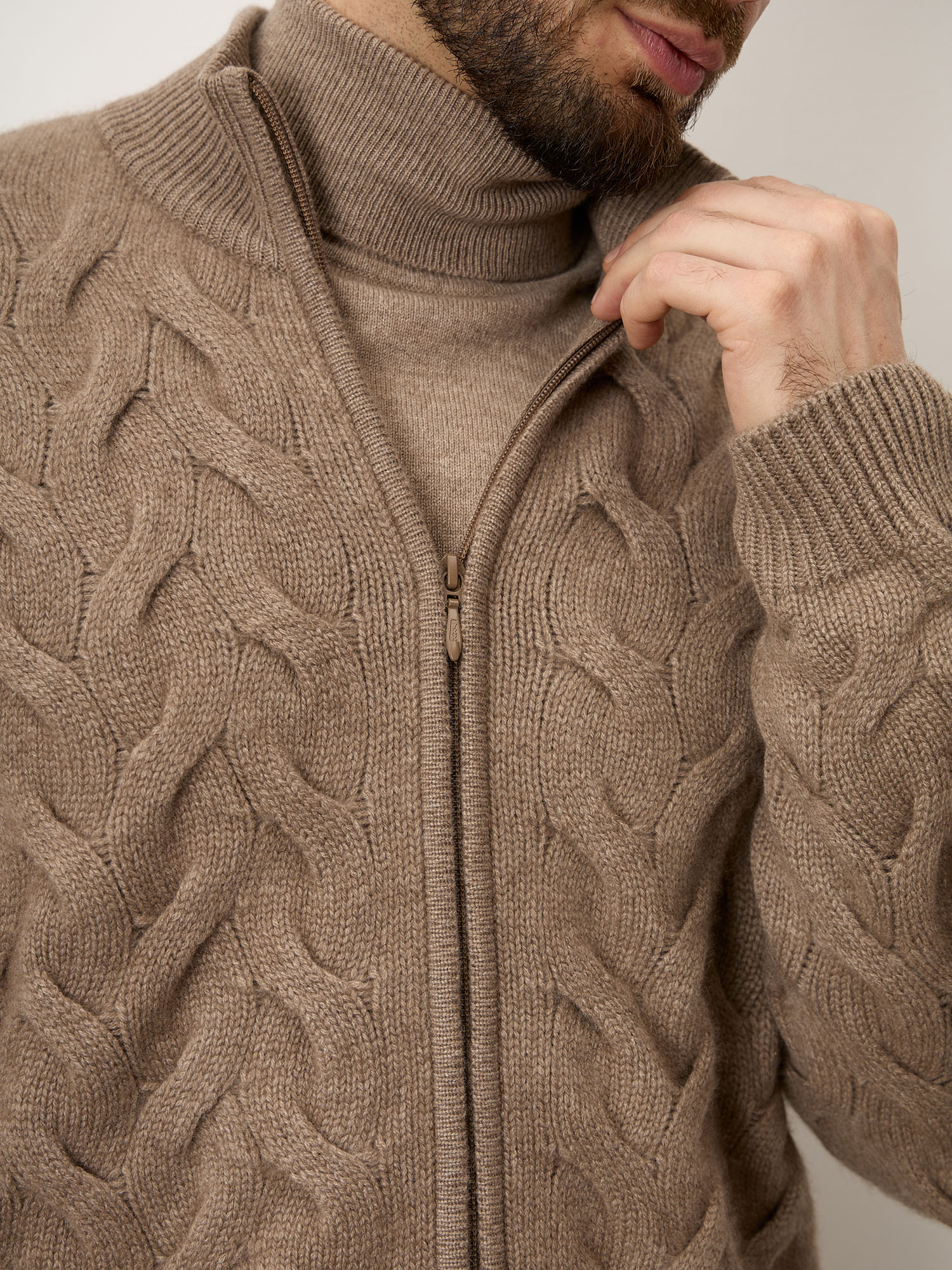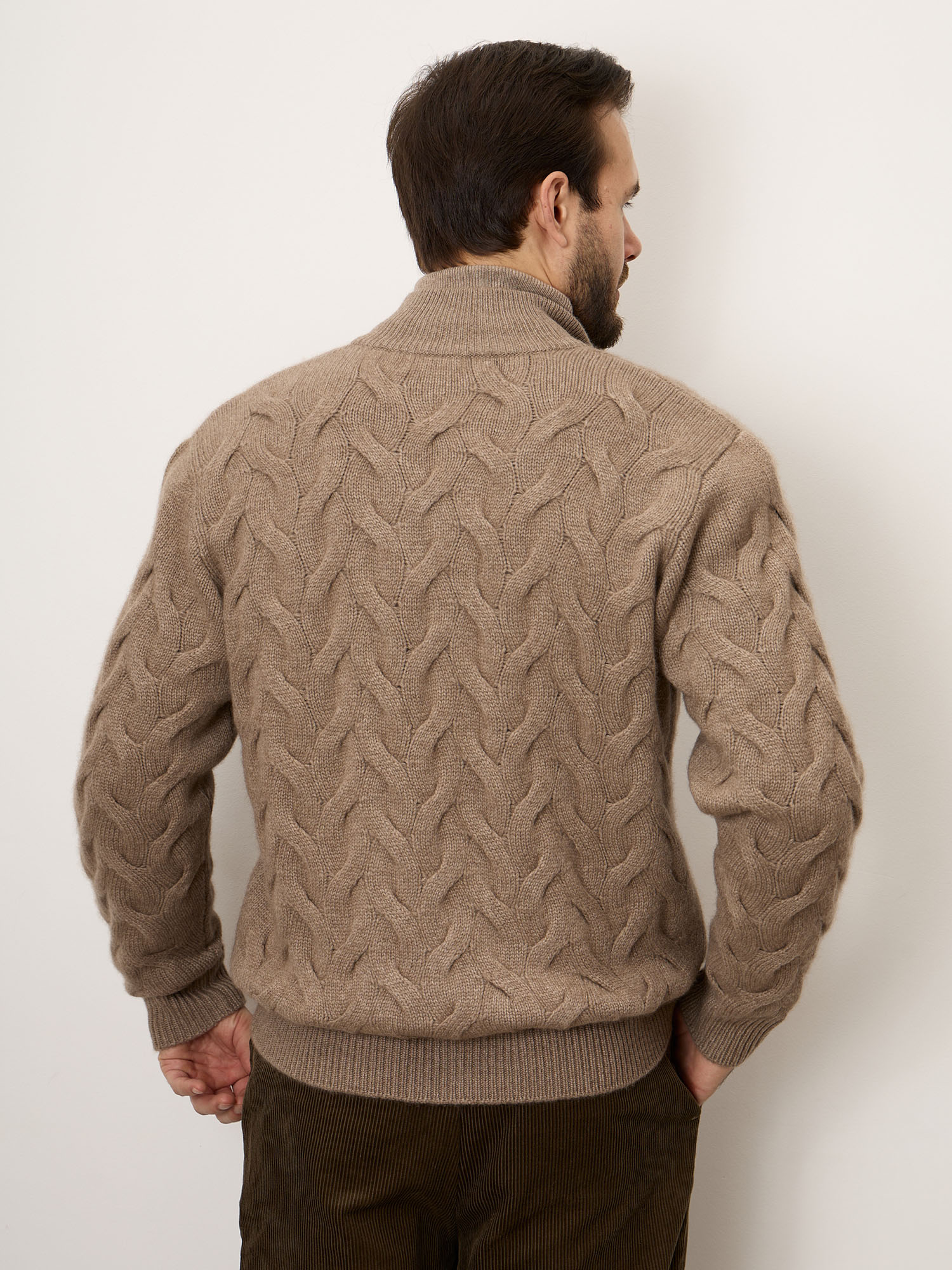 Классический силуэт с фактурной вязкой в виде кос. Аккуратный воротник на молнии добавляет функциональности и современного стиля.