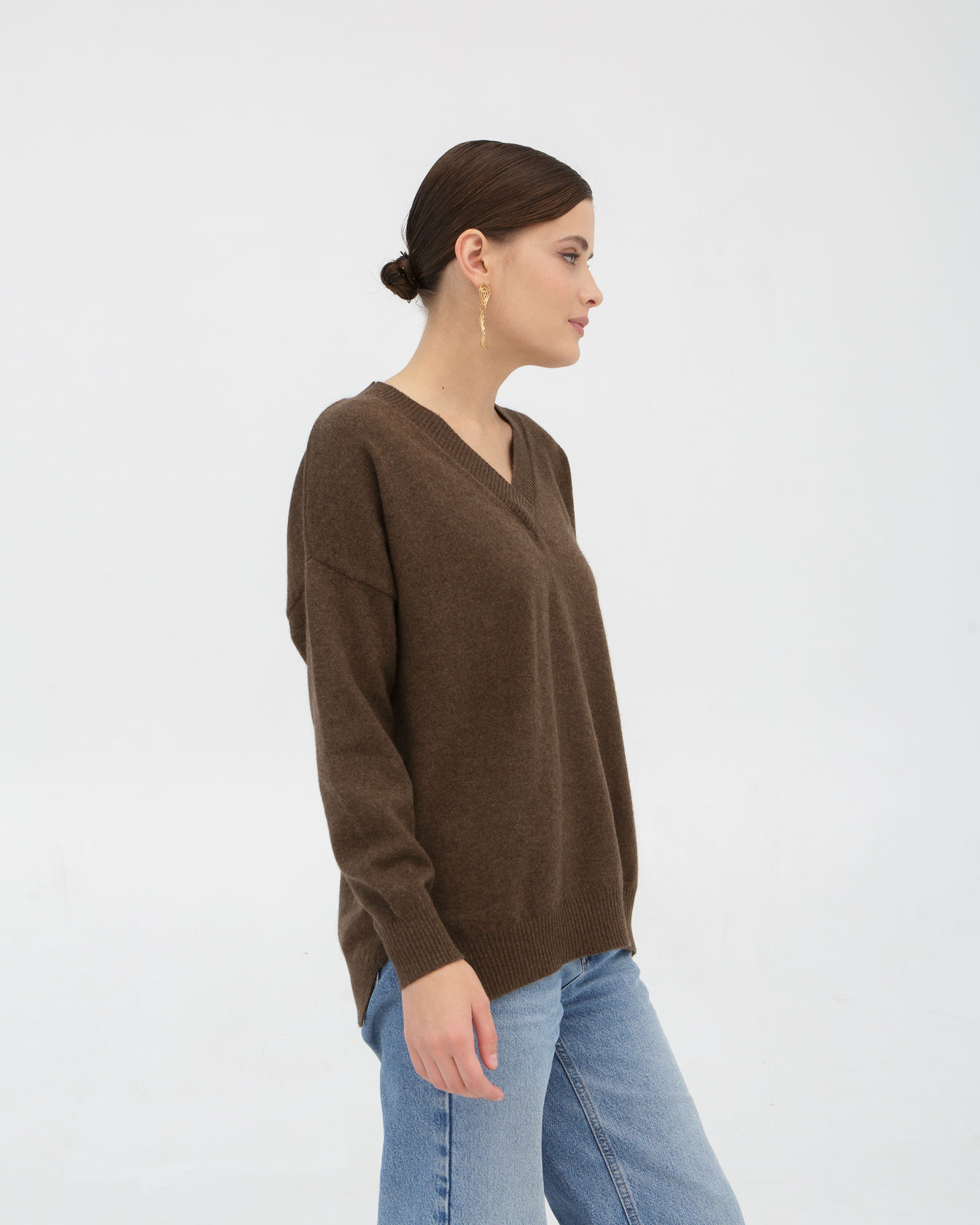 Модель выполнена в минималистичном стиле с V-образным вырезом и длинными рукавами. Свободный крой подчёркивает современный силуэт и делает джемпер удобным для повседневной носки.