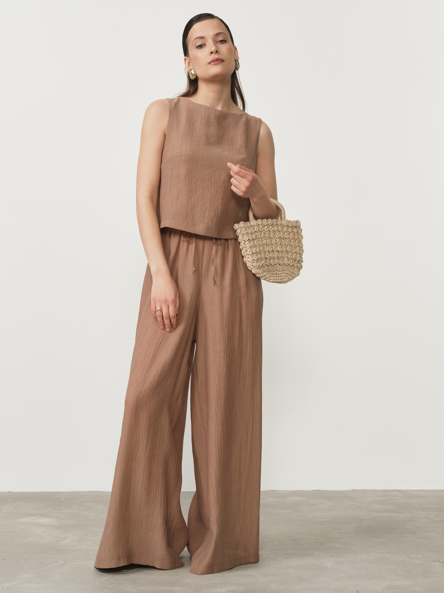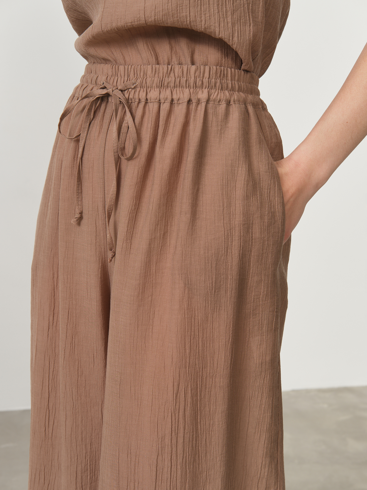 Модель выполнена в свободном крое, обеспечивающем максимальный комфорт и непринужденную элегантность. Эластичный пояс с декоративными завязками позволяет идеально адаптировать посадку по фигуре и создает стильный акцент. Благородный оттенок какао придает брюкам особую утонченность и универсальность – они прекрасно сочетаются как со светлыми, так и с темными верхними частями ансамбля.