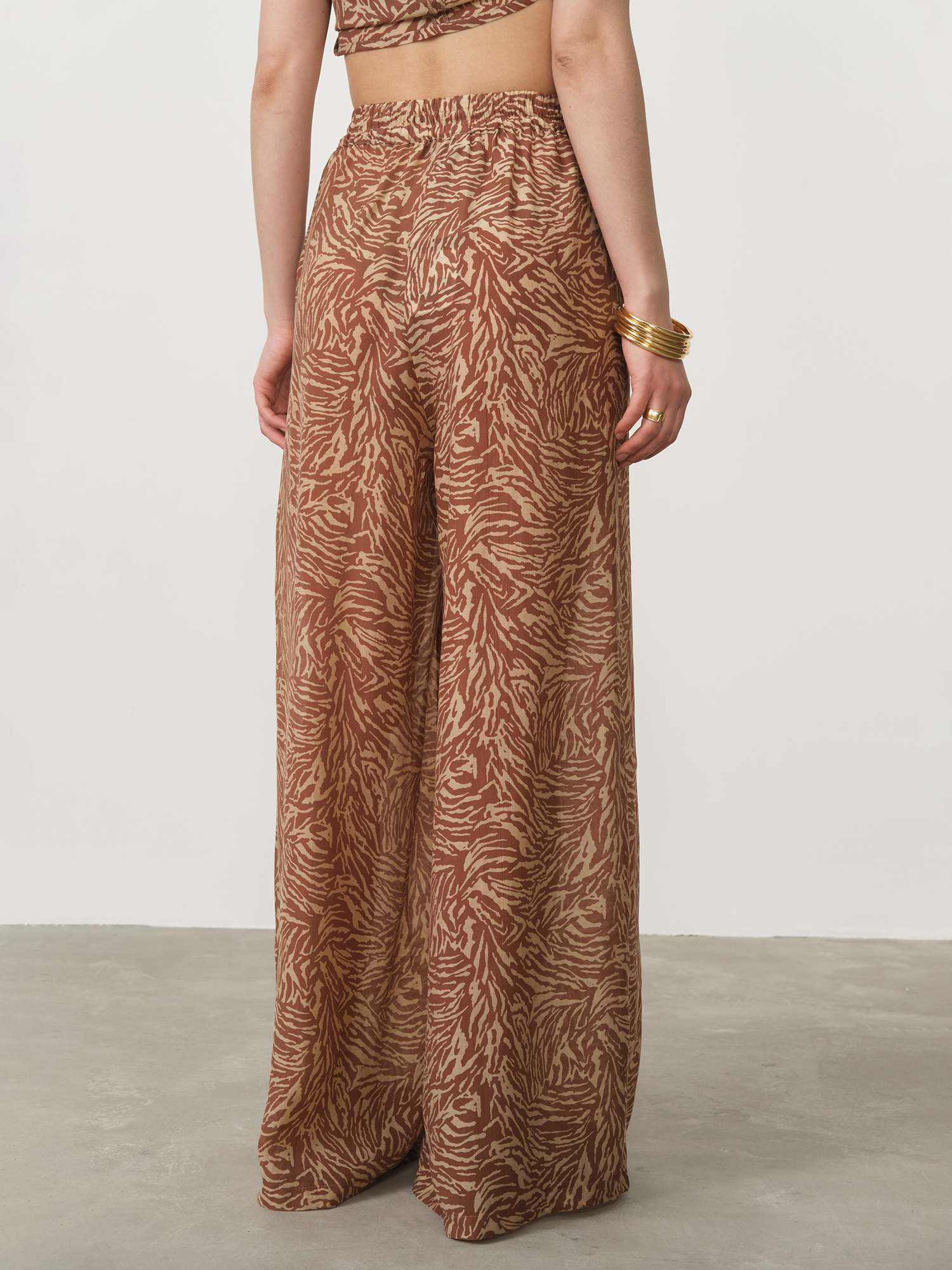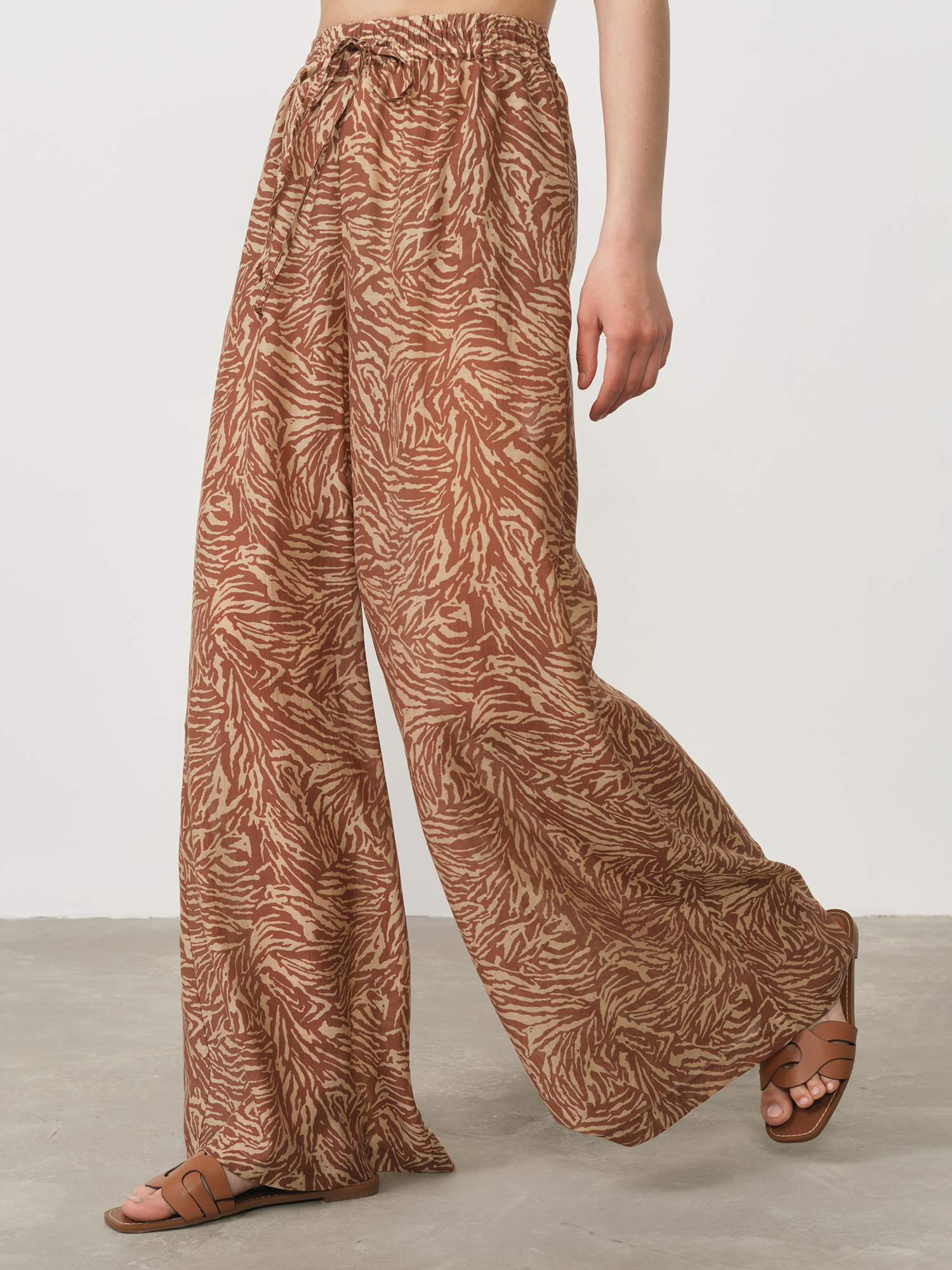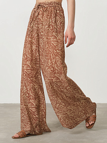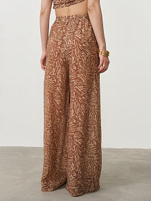 Модель имеет комфортный свободный крой, обеспечивающий непринужденную элегантность и абсолютную свободу движений. Эластичный пояс с декоративными завязками позволяет идеально адаптировать посадку по фигуре и создает дополнительный стильный акцент. Выразительный принт делает эти брюки ярким элементом образа, который привлекает внимание и подчеркивает индивидуальность своей обладательницы.