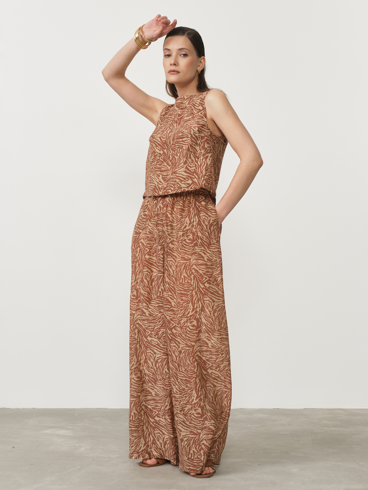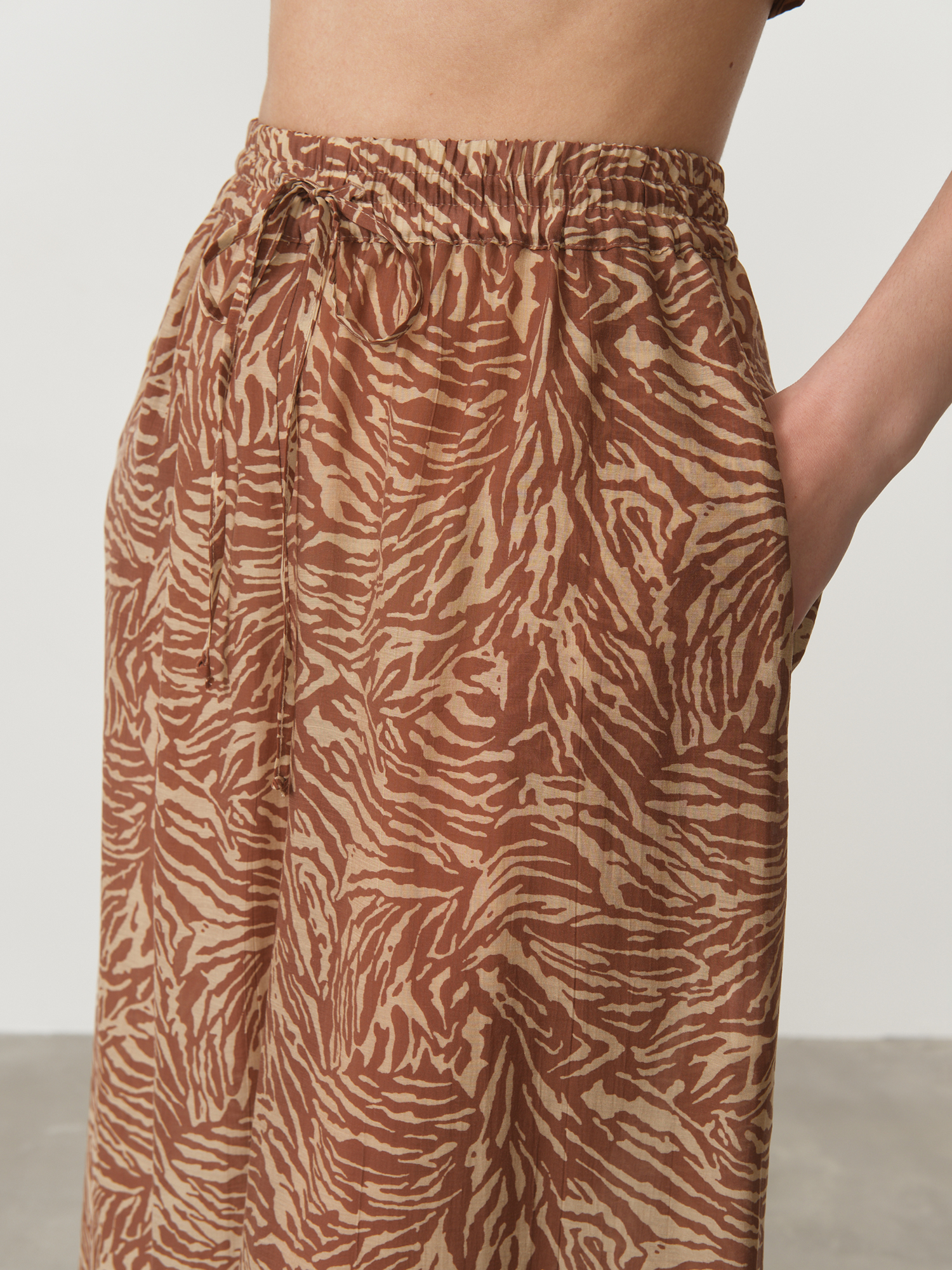 Стильные женские брюки из инновационного материала лиоцелл с оригинальным принтом в теплых коричневых тонах – идеальное сочетание комфорта, экологичности и современного дизайна. Лиоцелл – это прогрессивное растительное волокно, получаемое из древесной целлюлозы эвкалипта, которое обладает исключительной мягкостью, шелковистостью и превосходной драпируемостью, создавая эффектный струящийся силуэт. Этот уникальный материал сочетает лучшие свойства натуральных тканей с повышенной прочностью и износостойкостью.