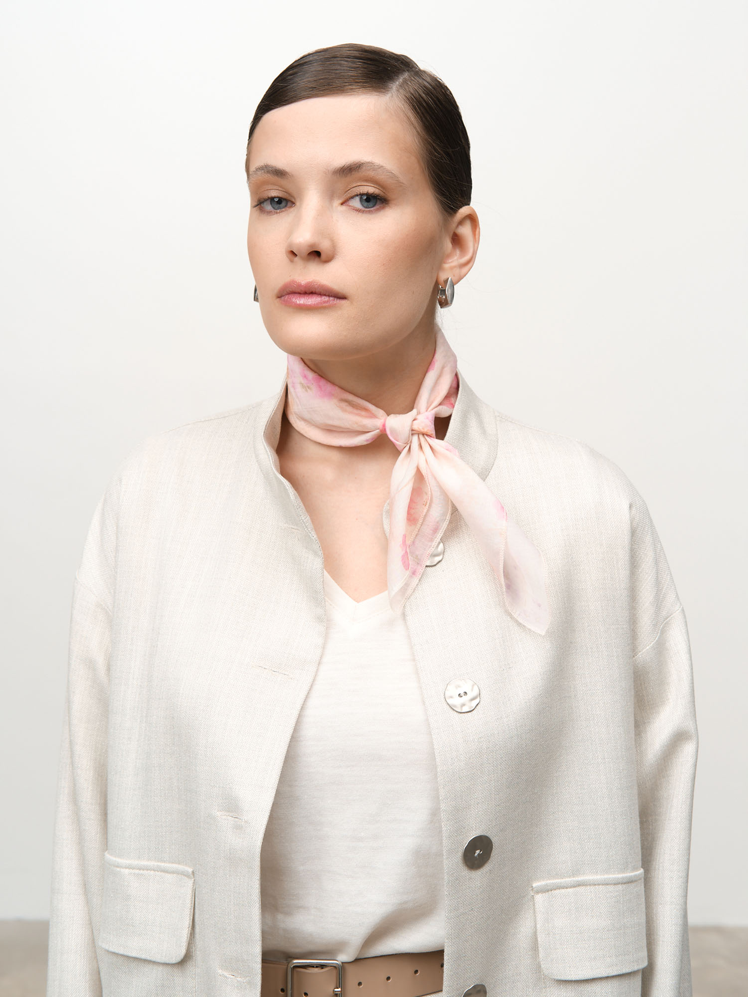 Легкий струящийся платок с аккуратно обработанными краями и утонченным принтом. Универсальный формат позволяет носить его разными способами.
