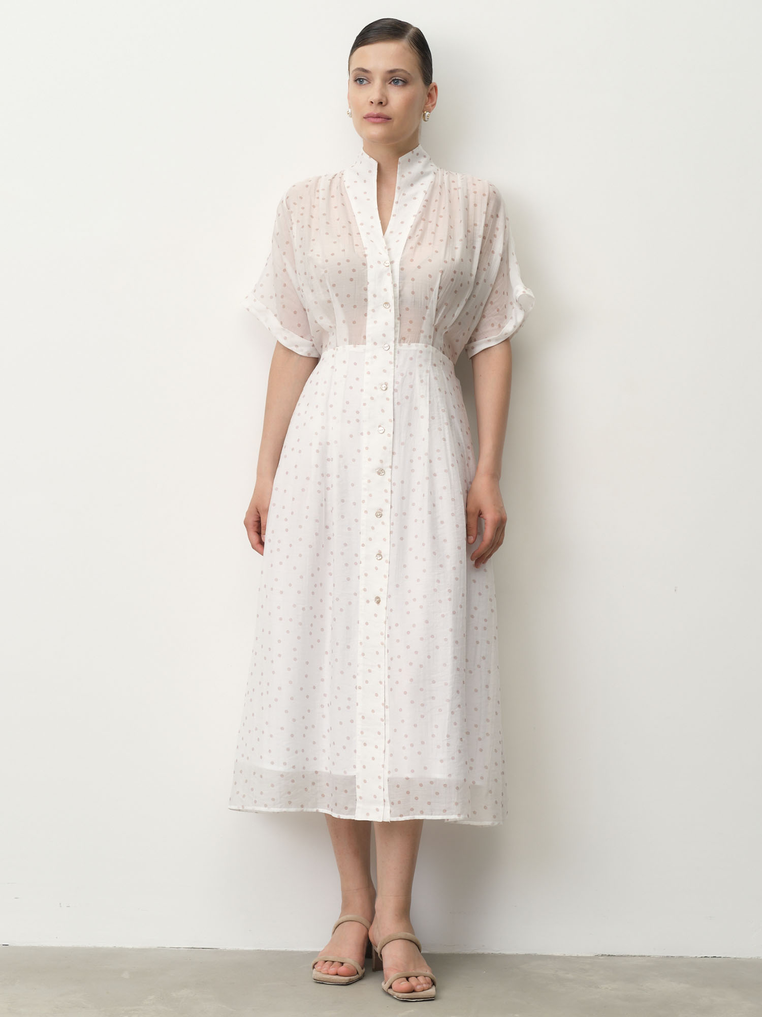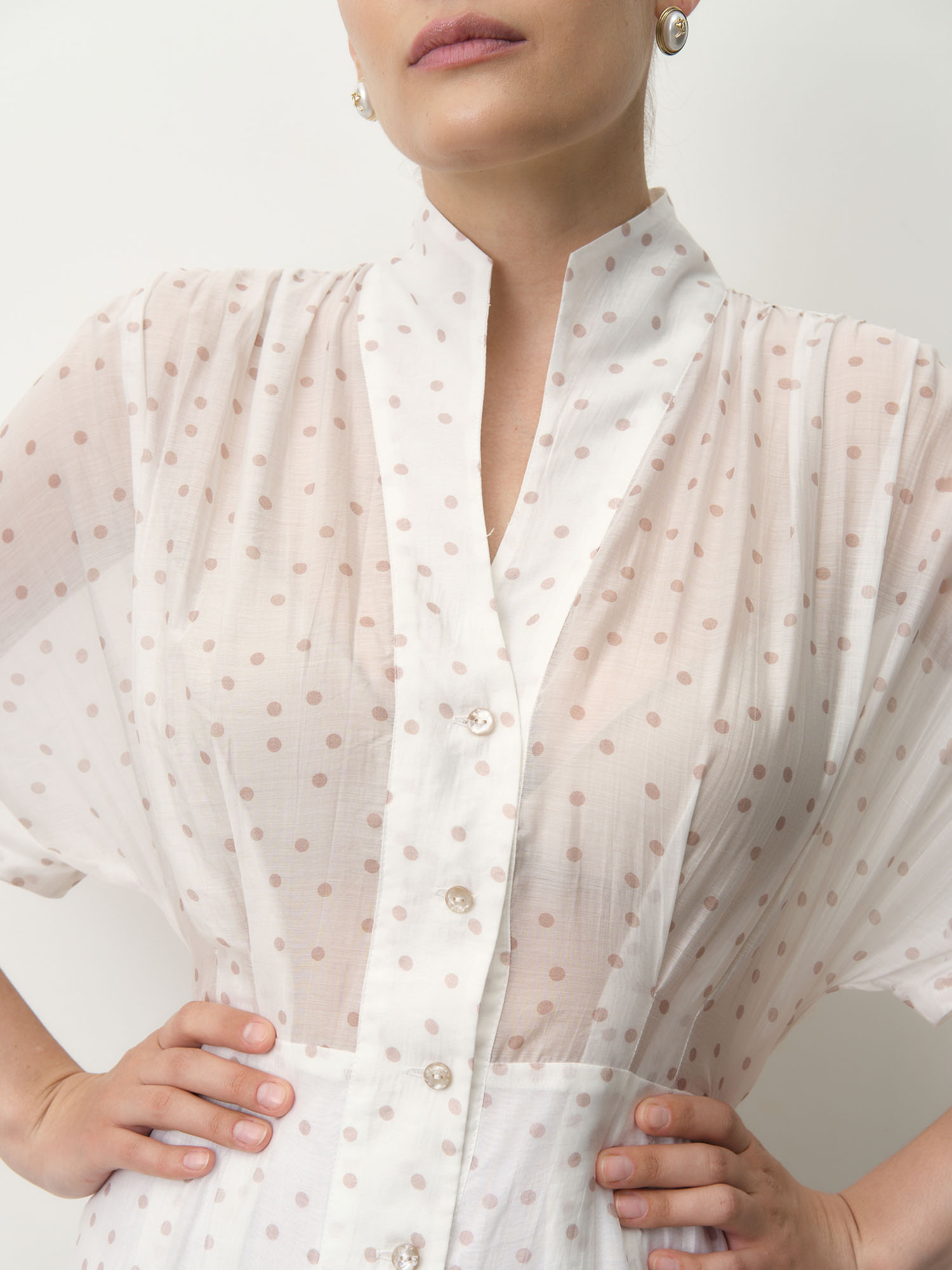 Белый в горошек — свежий и нежный оттенок с классическим принтом, придающим образу легкость и утонченность.