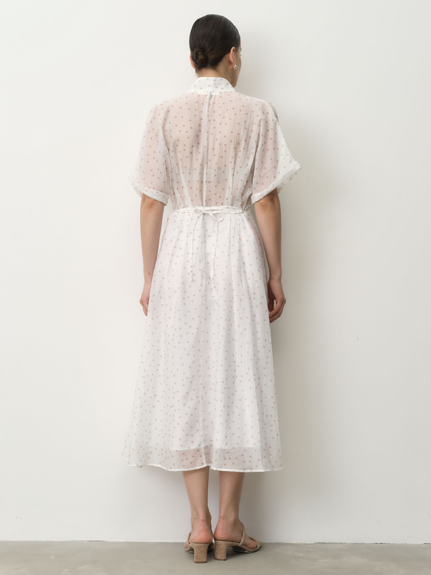 Свободный силуэт с акцентом на талии и длиной миди. Легкие рукава и струящаяся ткань создают плавный и изящный силуэт.
