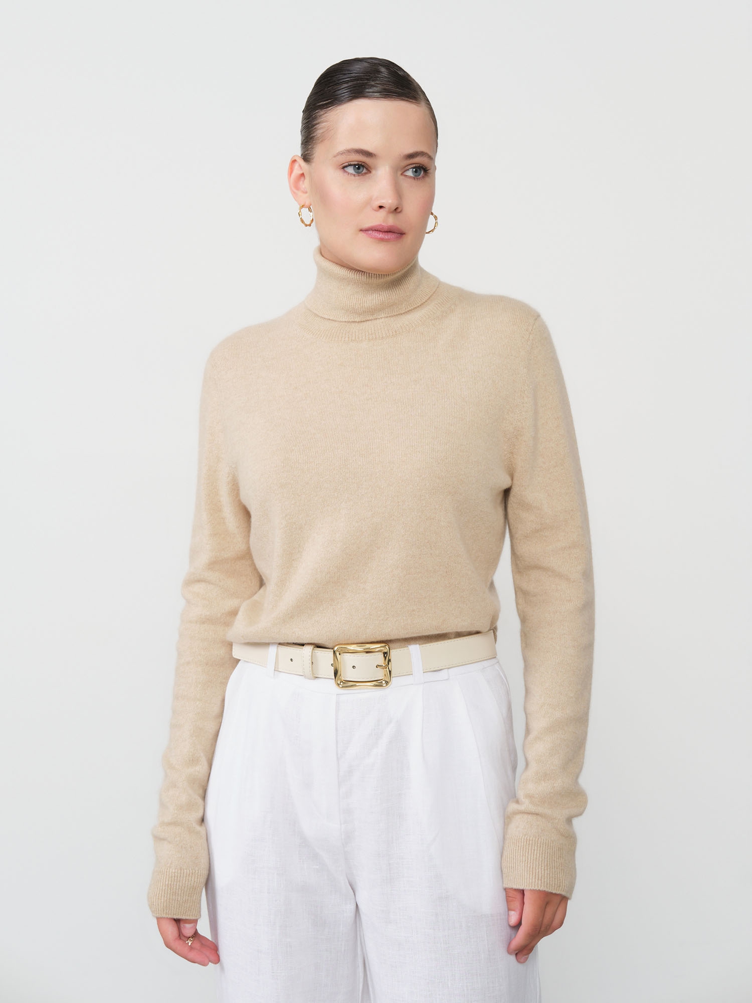 Модель выполнена в классическом стиле с высоким воротником-стойкой и гладкой вязкой. Чистые линии и лаконичный крой подчёркивают благородную текстуру материала.