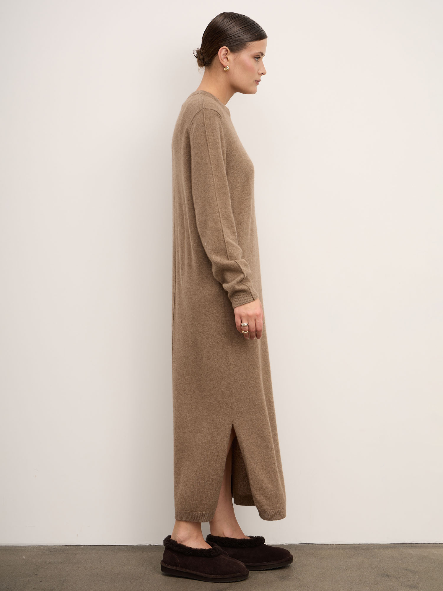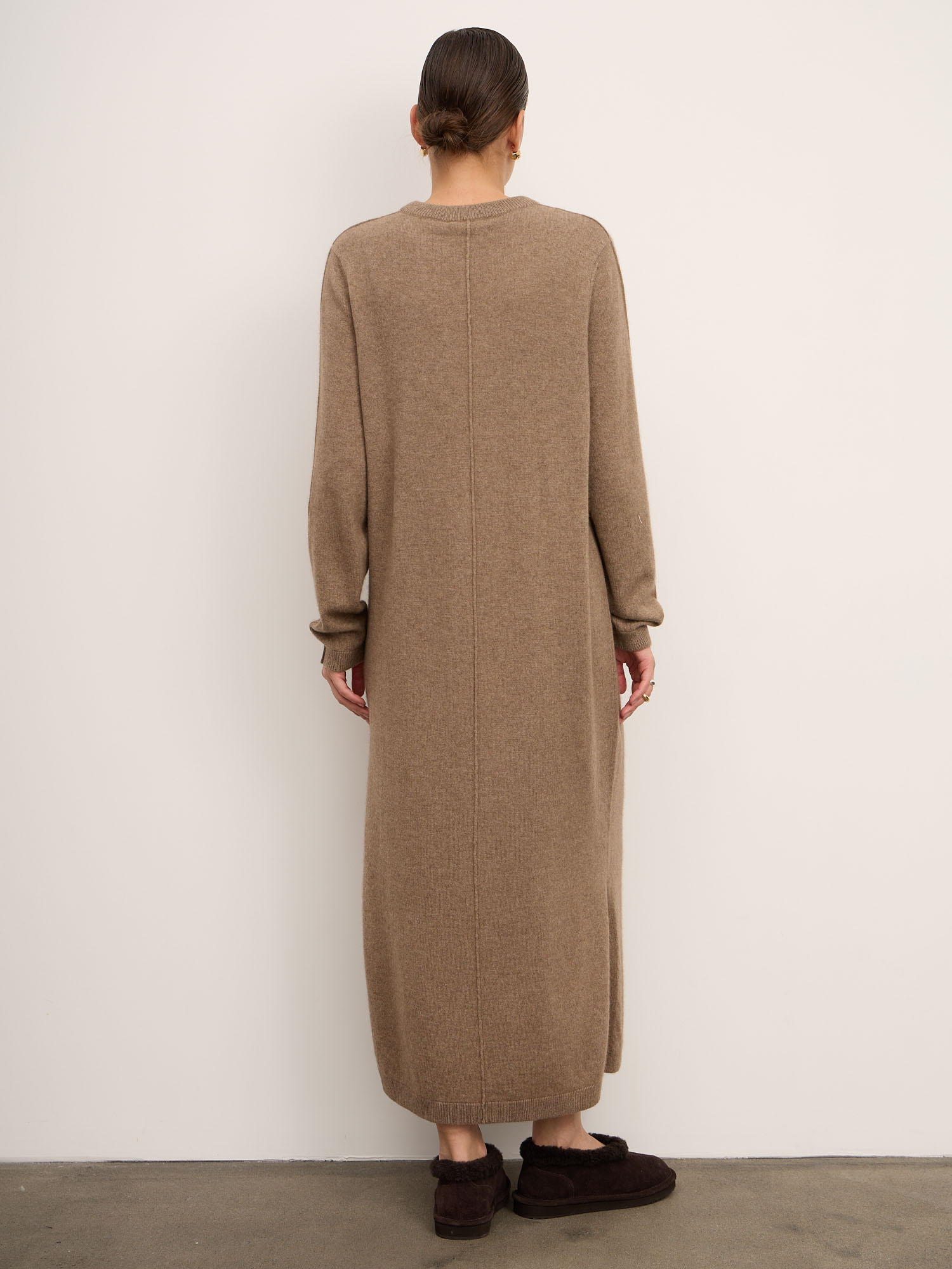 Платье из кашемира — изысканная модель в минималистичном стиле, сочетающая комфорт и элегантность. Свободный силуэт и мягкая фактура делают его идеальным выбором для повседневных образов с акцентом на уют и утончённость.