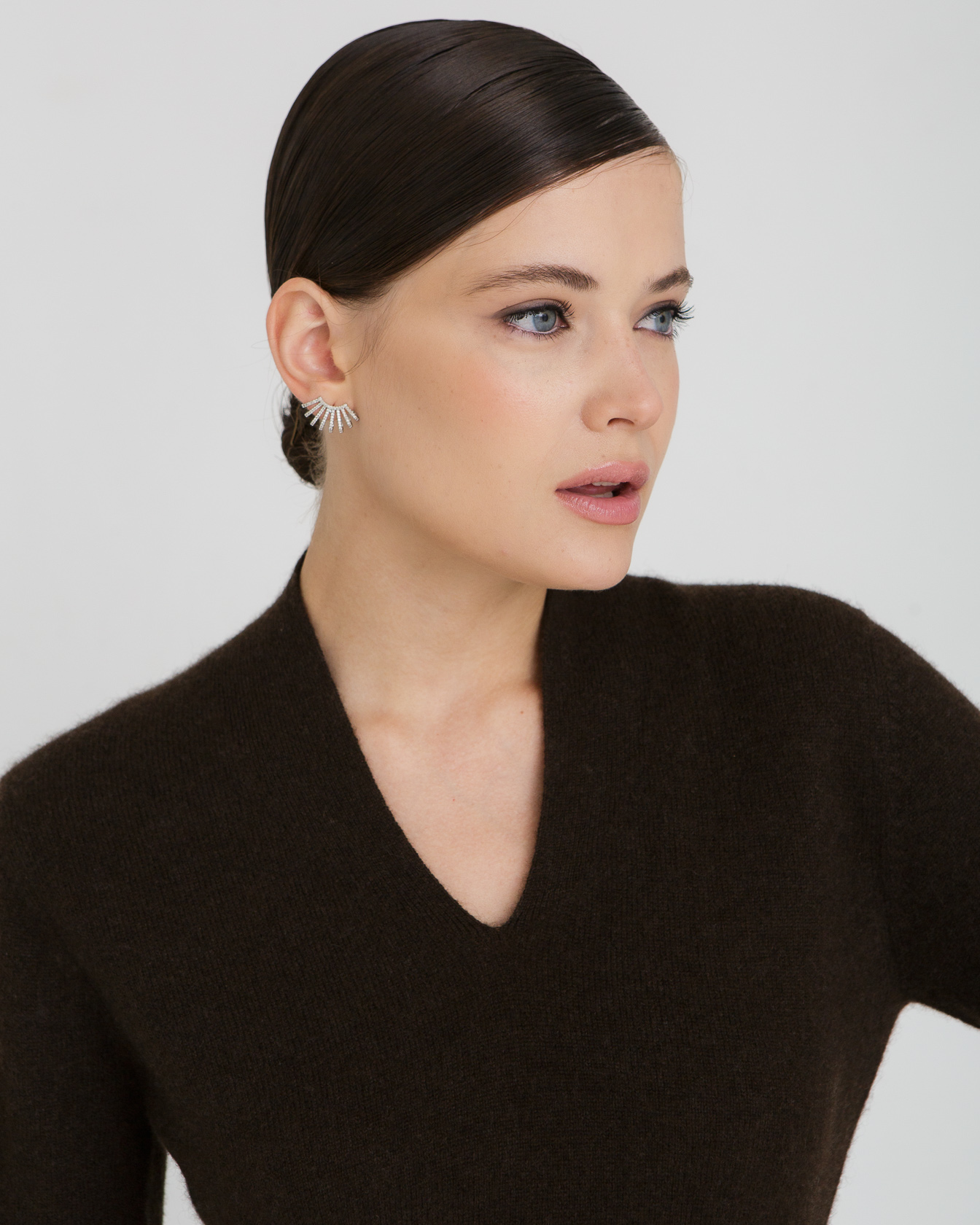 Модель выполнена в полуприлегающем силуэте с V-образным вырезом и длинными рукавами. Лаконичный крой подчёркивает фигуру, сохраняя удобство и свободу движений.