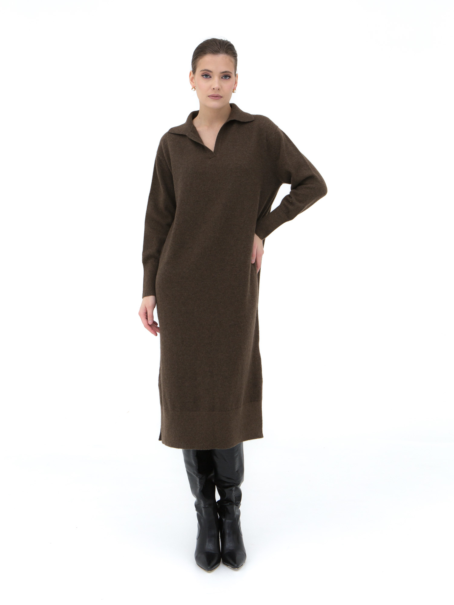 Прямой силуэт миди-длины с аккуратным воротником-поло и боковым разрезом для свободы движений. Лаконичный крой делает модель универсальной и вне времени.