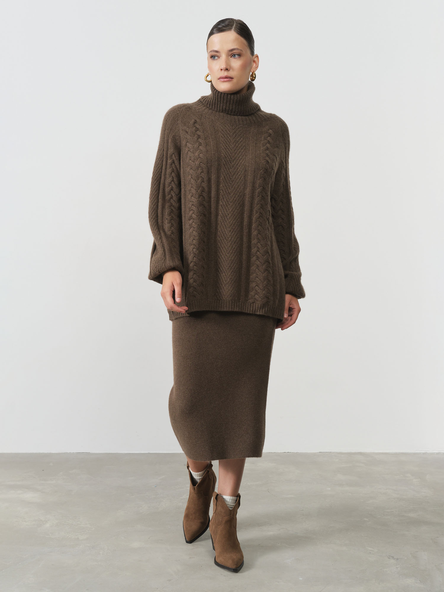Юбка отлично сочетается с джемперами, водолазками и кардиганами. Подходит для создания как повседневных, так и более элегантных образов. Гармонично смотрится с сапогами, ботильонами и классической обувью.